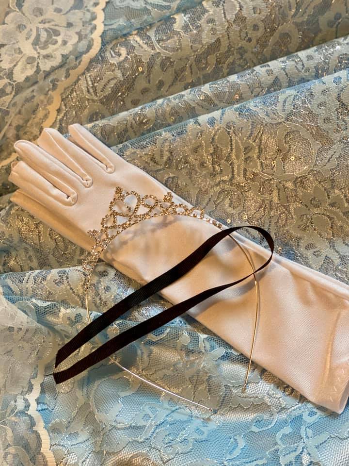 The perfect accessories to complete her royal look! This kit comes with satin opera length gloves, a dainty (lightweight and super easy to wear) tiara and a black Cinderella choker. These items are for HER TO KEEP! They will arrive in a package designated as such and she will be able to put them on time and time again for pretend play.
