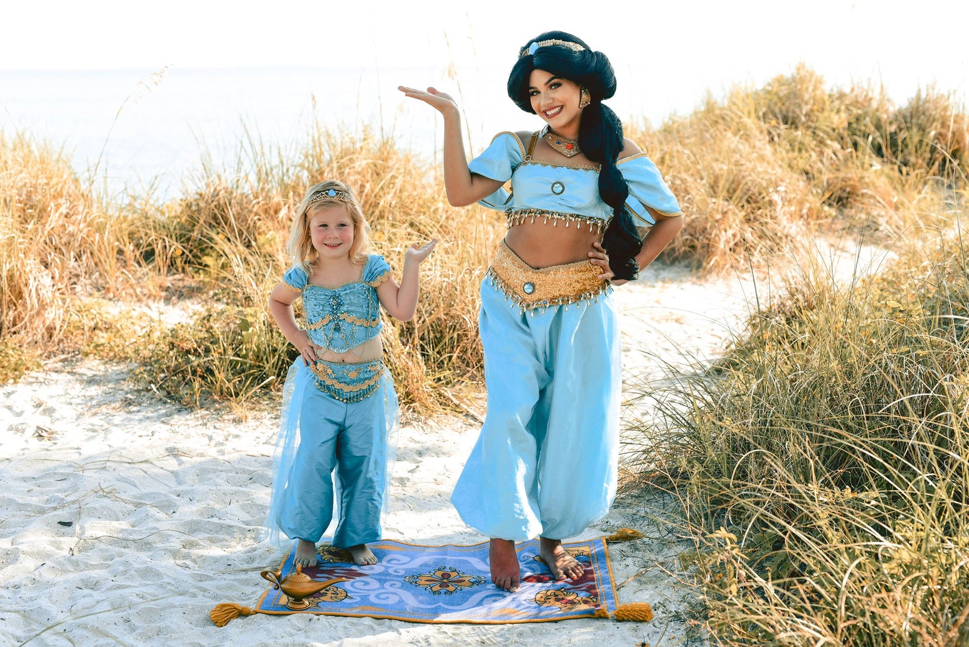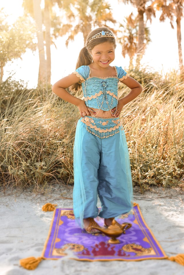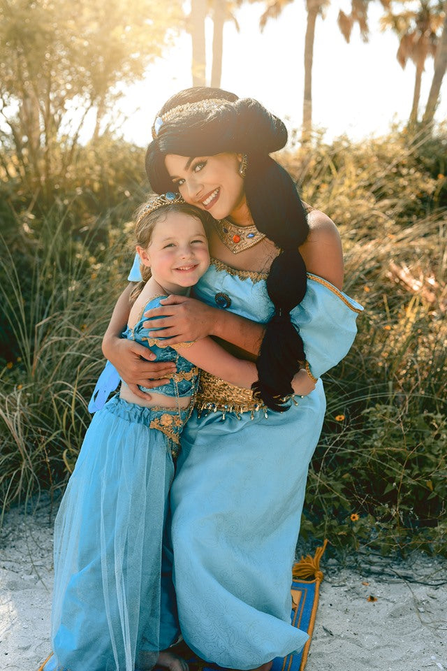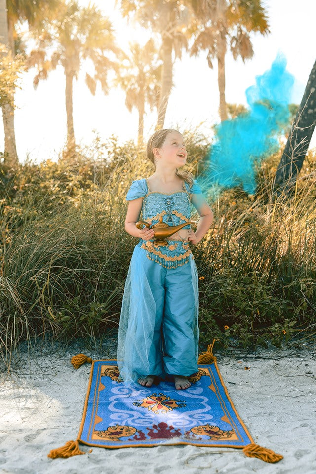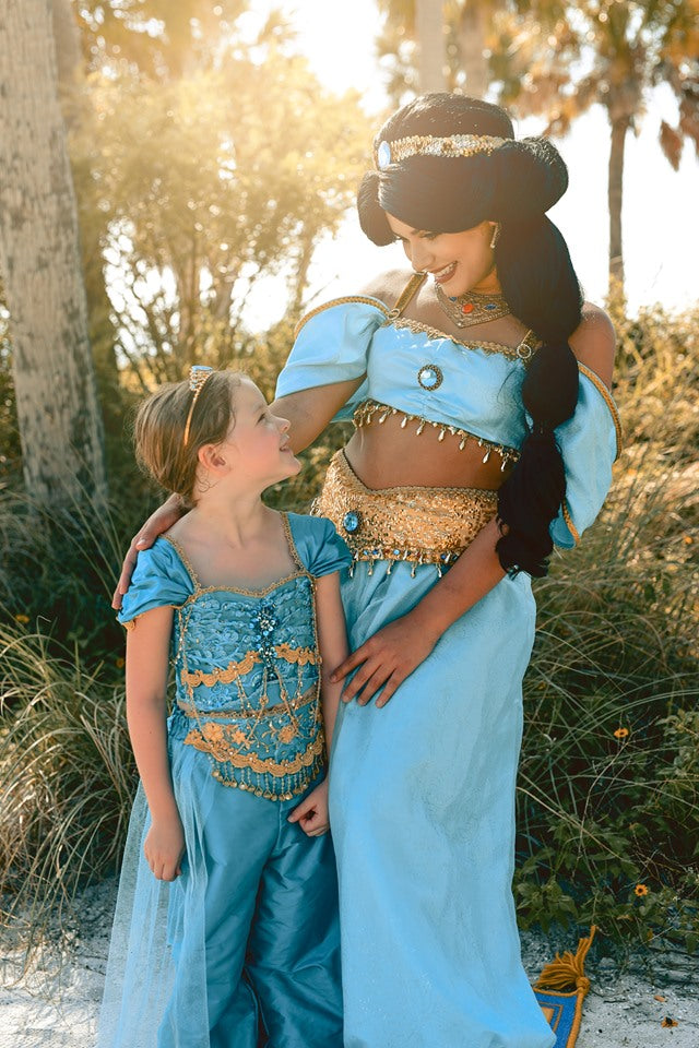 She will definitely be SPEECHLESS when she opens up the box from Your Fairy Godmother and pulls out this amazing couture version of Jasmine's iconic outfit. A beautiful cap sleeve design with adjustable lace up back features tons of gold detailing that will make her look like she just stepped out of her castle. The back of the flowy pants features elastic for an easy fit. Be sure to add on the Jasmine tiara (under the Accessories tab) to complete the look.