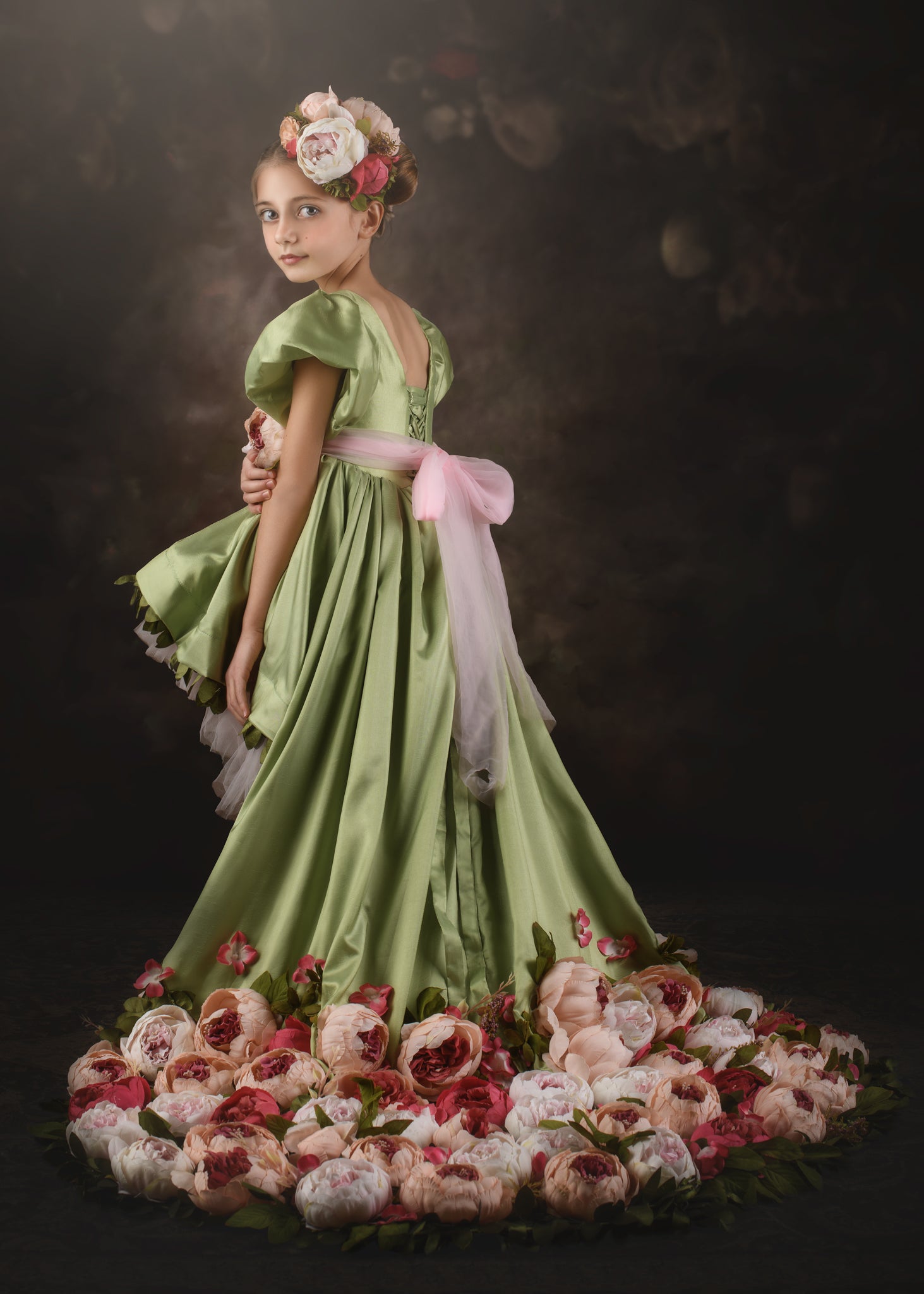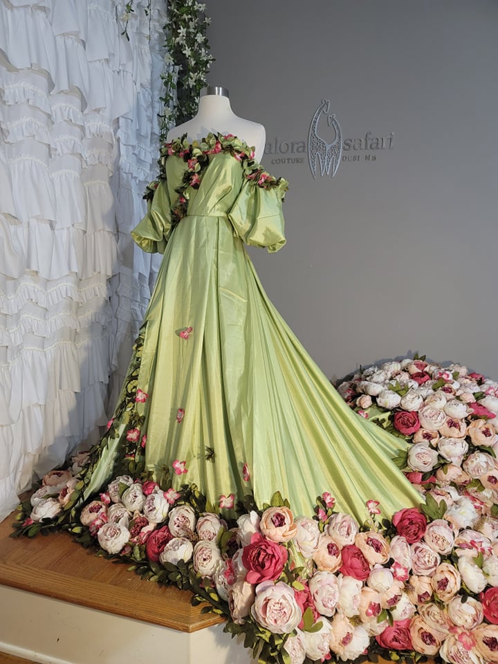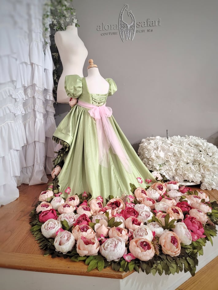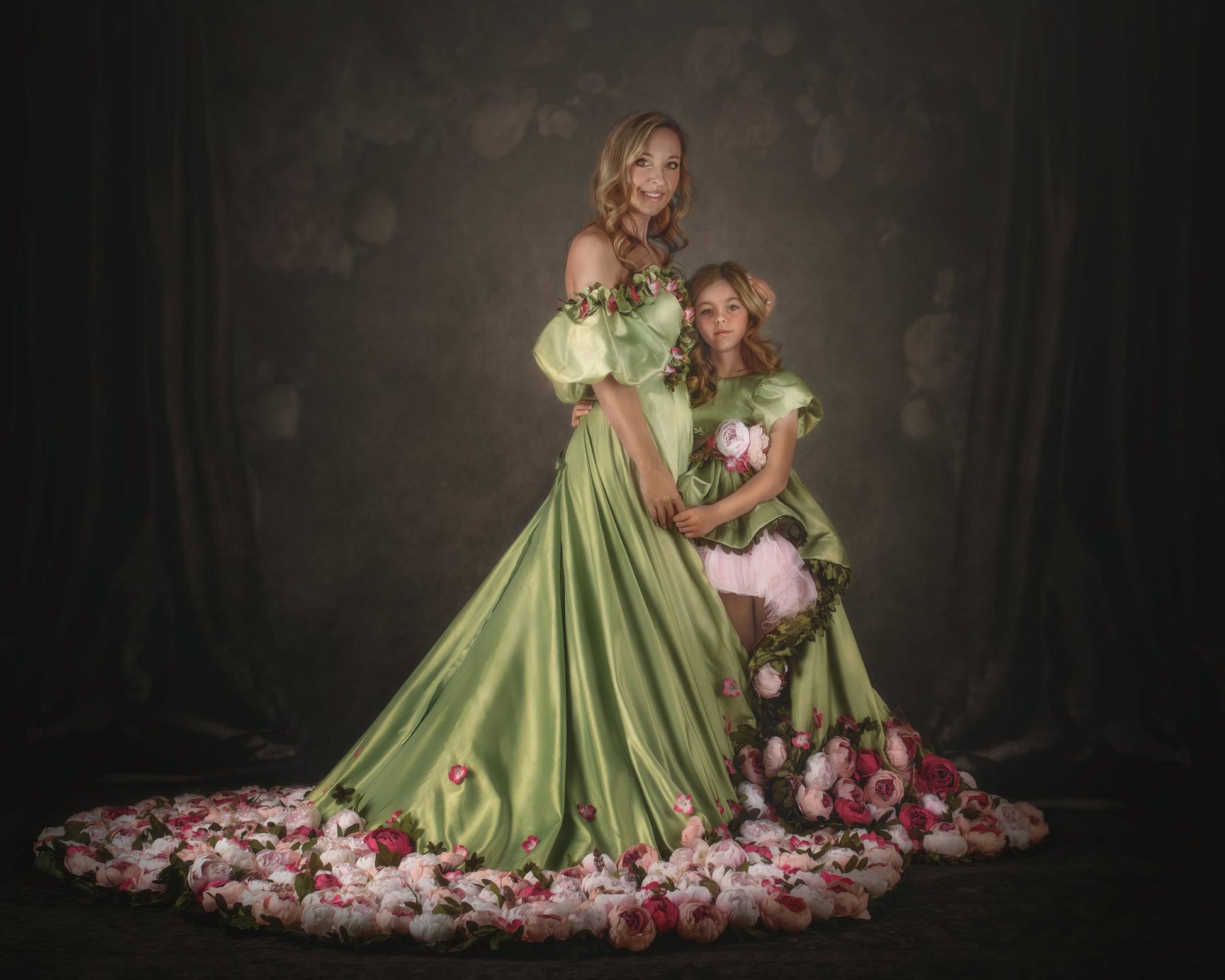 This set looks like a beautiful garden of flowers came to life! Perfect for a Mommy & Me shoot or a Big Sis & Lil Sis shoot, these gowns complement each other perfectly. Made of a gorgeous green satin and dripping with florals, the bigger dress features an off the shoulder designer and a leg side slit for ease of movement. The child's dress features a petti skirt of pink tulle peeking out from under the leaves on the front of the dress and has a long, dramatic, floral strewn train for a cute high/low look. Hundreds of faux flowers were hand placed on the dresses for a truly haute couture look. Simply put, these dresses are a work of art and will make for a memorable experience at any photoshoot.