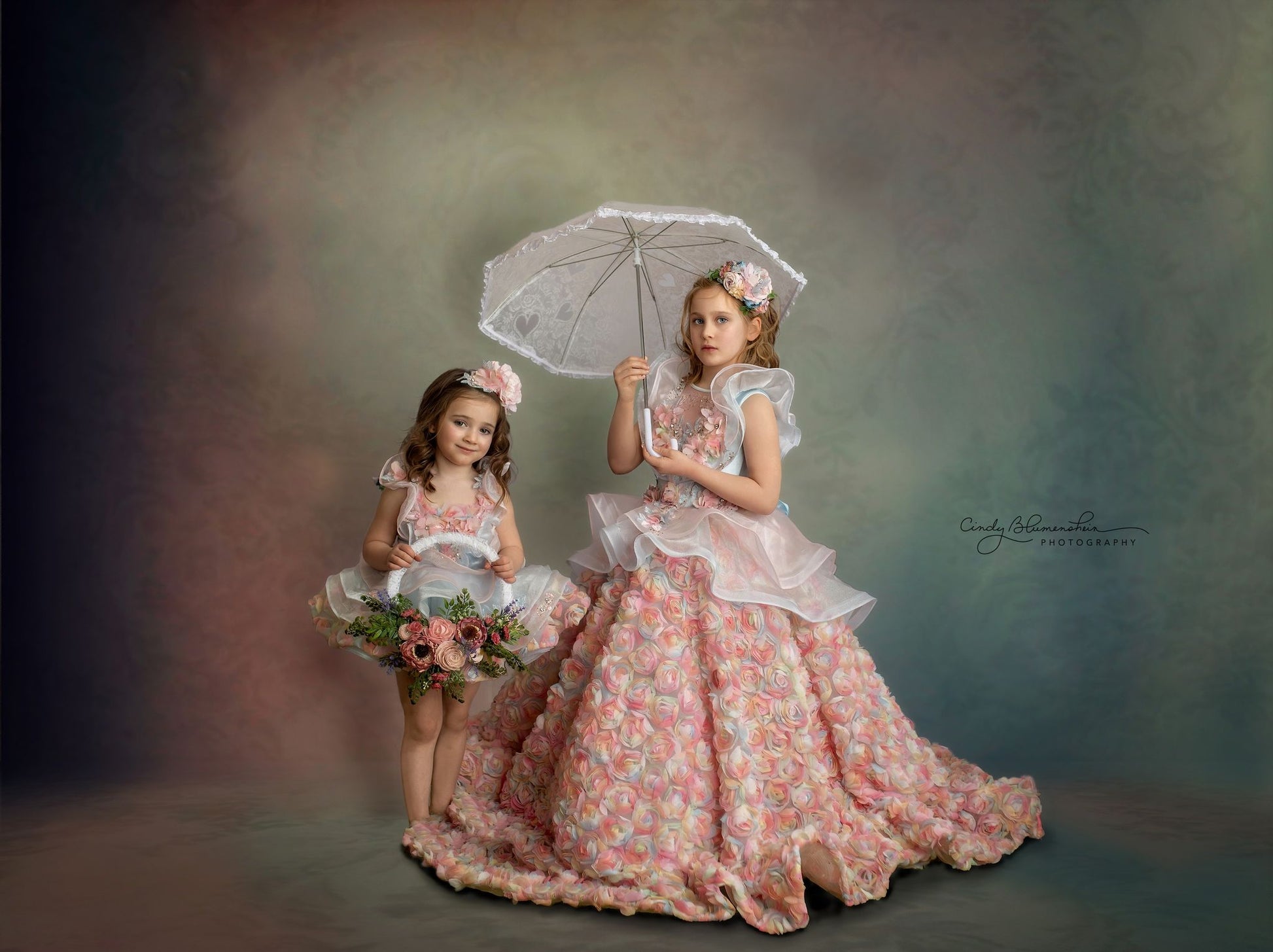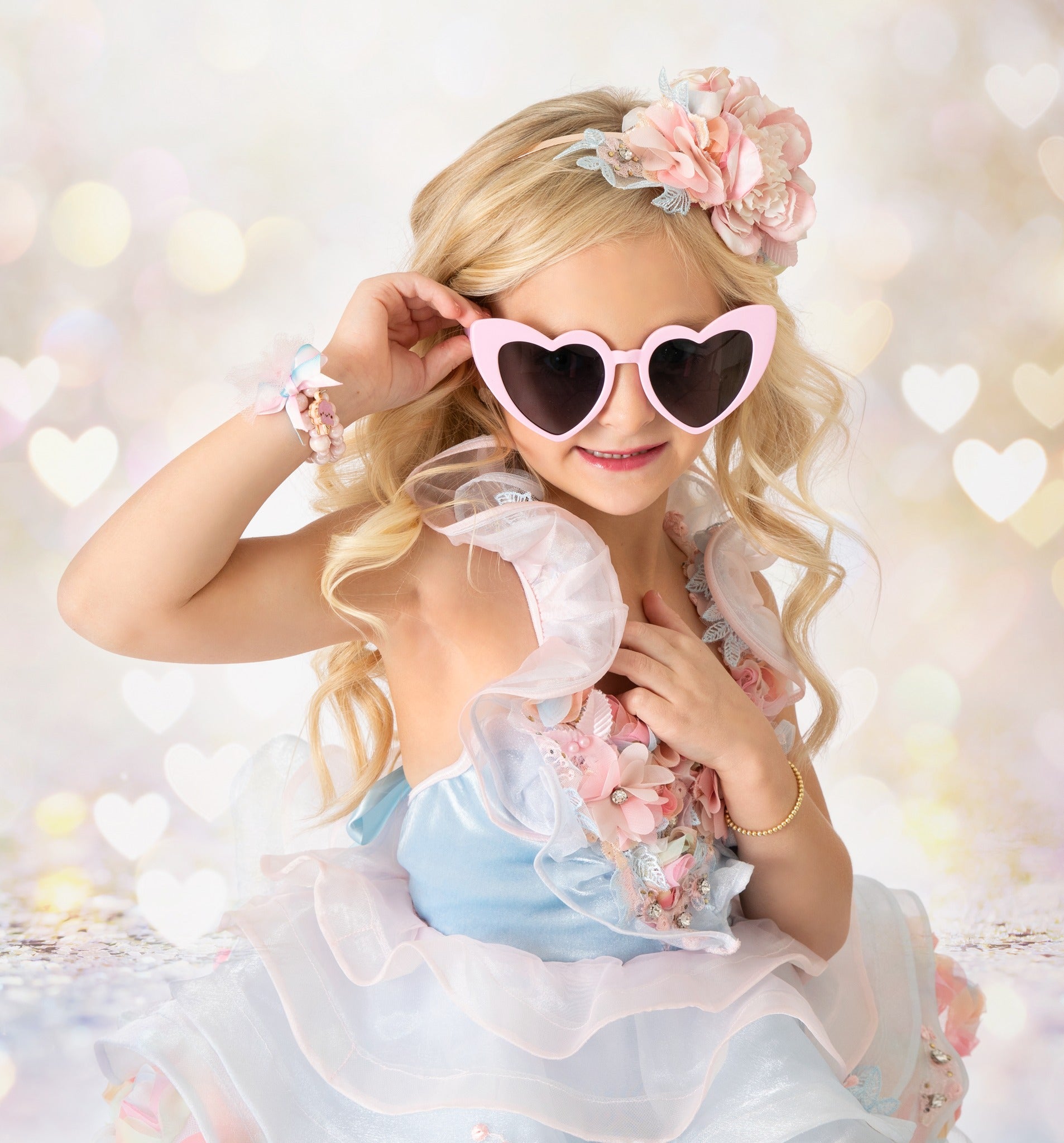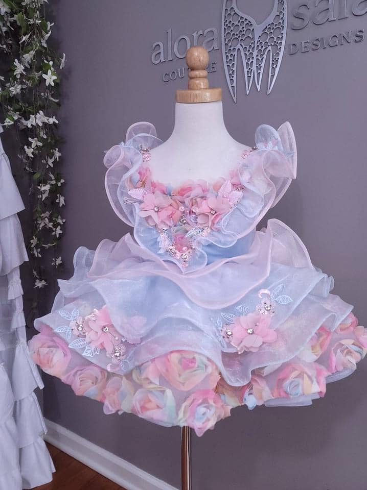 Perhaps one of the most beautiful dresses I've ever seen, Rainbow Rose features a cascade of the most beautiful pastel rainbow roses on the skirt. This skirt is super full and fluffy and meant to be a 'vintage fit' on the child. The dress features a baby blue stretch top adorned with sparkling flowers and the look is completed by a ruffle peplum at the waist and ruffle flutter sleeves. This dress best fits sizes 2/4/5/6. With a stretch bodice, the dress is very accommodating to a wide range of sizes and body shapes. Don't forget to add on the Big Sister dress for a sweet sister set! *Dress comes with made to match headpiece shown as well as floral bloomers to wear underneath the dress*